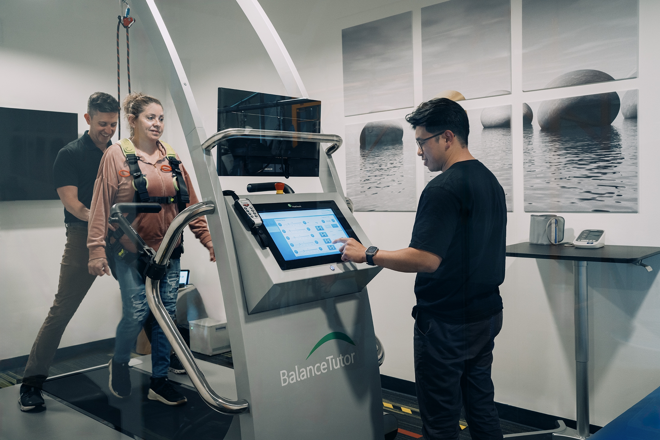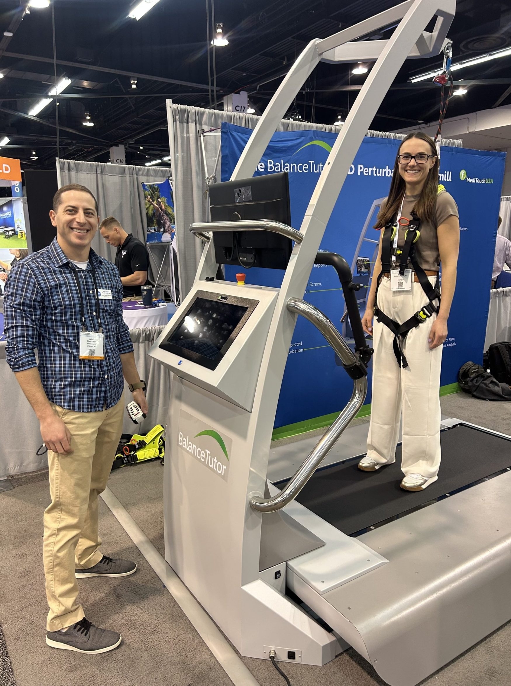 The BalanceTutor system includes a patented multidirectional perturbation treadmill and multiple force and movement sensors which allow patients impacted by impaired balance to react to unanticipated disturbances while standing or walking.